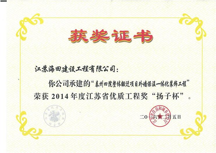 熱烈祝賀我司承建的泰州四院整體搬遷項(xiàng)目外墻保溫一體化工程被評(píng)為江蘇省優(yōu)質(zhì)工程獎(jiǎng)“揚(yáng)子杯”
